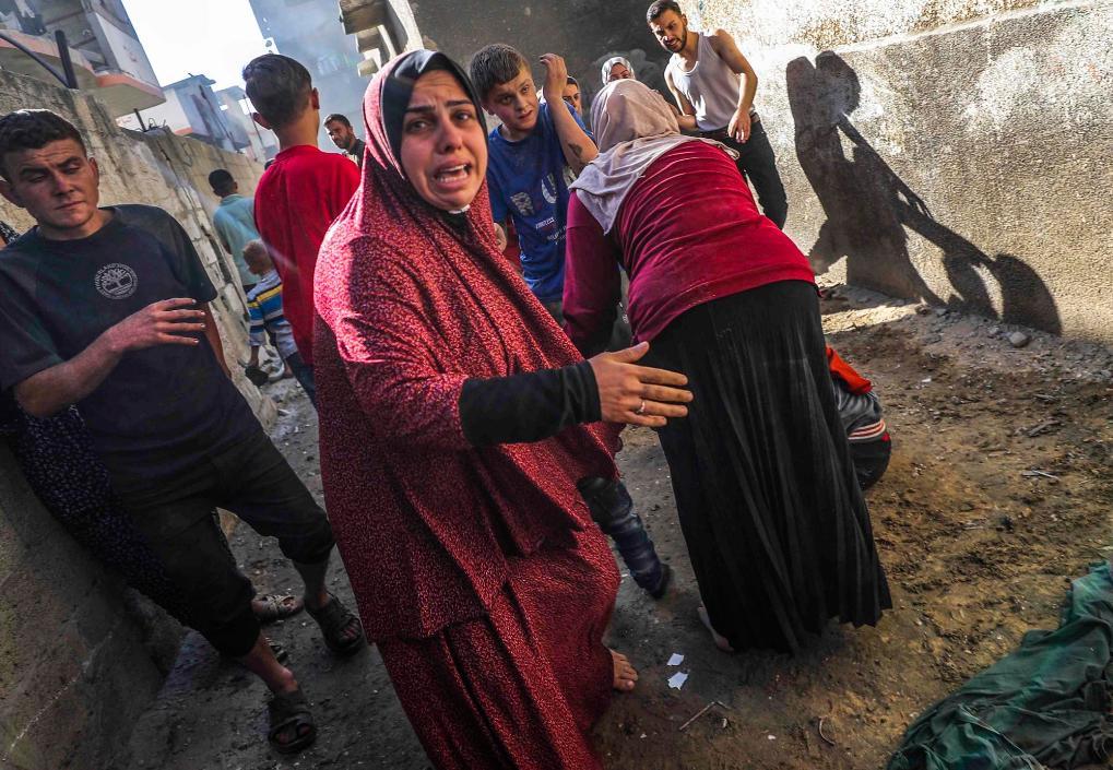 5月21日,在以軍空襲加沙地帶北部杰巴利耶難民營所在區(qū)域后,當?shù)匕屠账固谷讼萑牖艁y。新華社發(fā)(馬哈茂德·扎基攝)