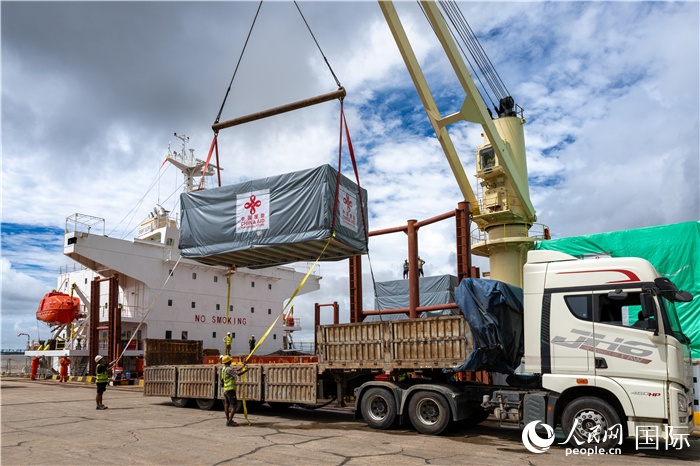 5月25日,當(dāng)?shù)毓と嗽诟劭趶呢涊喩闲遁d援緬第十五批緊急人道主義地震救災(zāi)物資。人民網(wǎng)記者謝佳君攝