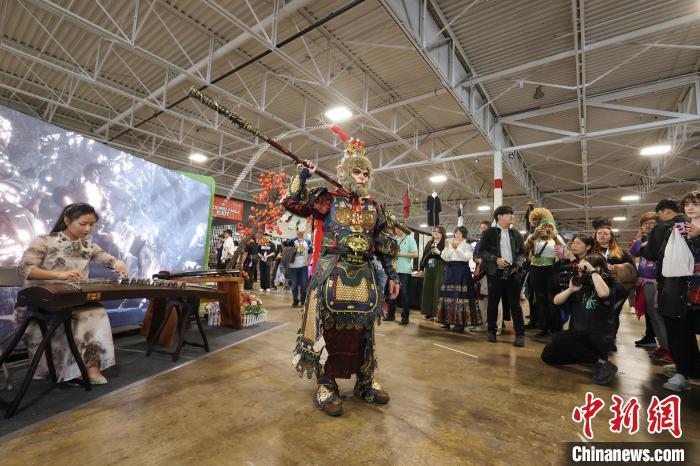 在活動(dòng)現(xiàn)場(chǎng),一位動(dòng)漫coser(角色扮演者)以中國(guó)國(guó)產(chǎn)游戲《黑神話:悟空》的悟空形象現(xiàn)身,在古箏演奏的《云宮迅音》等樂(lè)曲伴奏下舞起如意金箍棒。一時(shí)間,這一快閃表演吸引了大批動(dòng)漫迷圍觀。