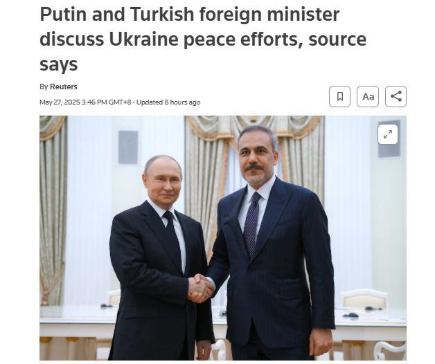 中新網(wǎng)5月28日電 據(jù)路透社當(dāng)?shù)貢r間27日報道,土耳其外交部消息人士稱,俄羅斯總統(tǒng)普京和土耳其外交部長費(fèi)丹在莫斯科會晤,討論了結(jié)束烏克蘭危機(jī)的努力以及俄烏雙方直接談判以來取得的進(jìn)展。