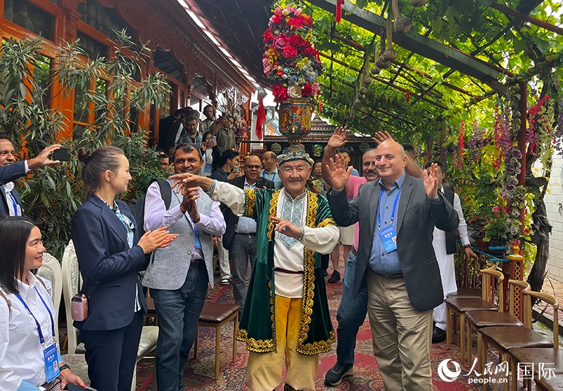 5月24日,外國(guó)媒體人在伊寧市喀贊其民俗旅游區(qū)參觀體驗(yàn)。 人民網(wǎng)記者 翟轉(zhuǎn)麗攝