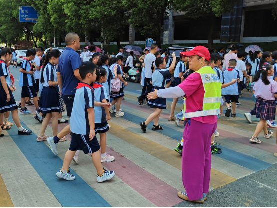 5月28日,烈日當(dāng)空,大冶濱湖學(xué)校門口,隨著宋慶莉的手勢(shì),汽車長(zhǎng)龍緩緩?fù)O?。斑馬線前,一隊(duì)學(xué)生有序過馬路。