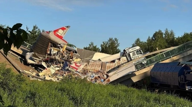 5月31日22時50分,布良斯克州維戈尼奇-皮利希諾鐵路段因爆炸導(dǎo)致公路橋梁結(jié)構(gòu)坍塌,橋體殘骸墜落在下方通過的客運列車上,造成人員傷亡。(總臺記者 徐鴻波)