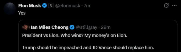 馬斯克當(dāng)天在社交媒體平臺(tái)“X”上一則有關(guān)支持彈劾特朗普的貼文中回復(fù)“是的”。