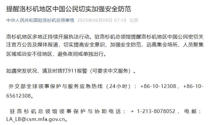中新網(wǎng)6月9日電 據(jù)中國駐洛杉磯總領(lǐng)事館公眾號9日消息,洛杉磯地區(qū)多地正持續(xù)開展執(zhí)法行動。駐洛杉磯總領(lǐng)館提醒洛杉磯地區(qū)中國公民密切關(guān)注官方公告及媒體報道,切實提高安全意識,加強安全防范,遠離集會場所、人員聚集區(qū)域或治安不佳地區(qū),避免夜間或單獨出行。