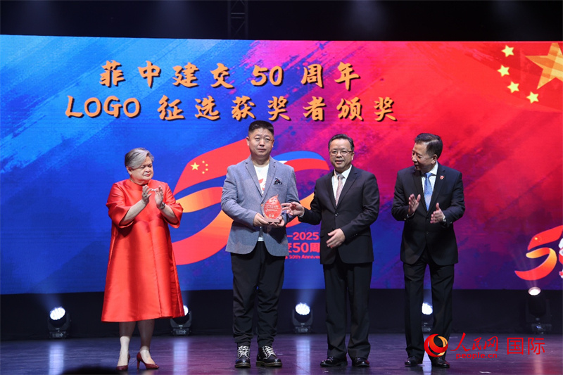 黃溪連和菲外交部候任部長(zhǎng)拉扎羅給菲中建交50周年慶?;顒?dòng)標(biāo)識(shí)設(shè)計(jì)獲獎(jiǎng)?wù)哳C獎(jiǎng)。人民網(wǎng)記者 樊帆攝