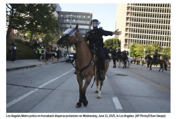 中新網(wǎng)6月12日電 據(jù)美聯(lián)社報(bào)道,當(dāng)?shù)貢r(shí)間11日,美國洛杉磯市政廳前爆發(fā)示威活動(dòng),部分警察騎馬沖撞示威者。