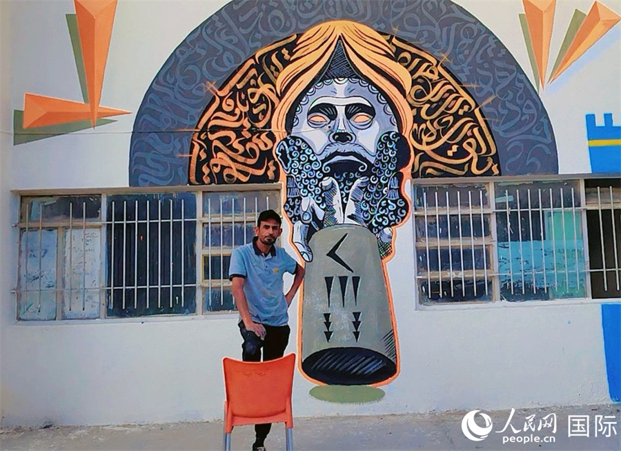 阿里·哈利法和他的壁畫(huà)。人民網(wǎng) 伊納斯·易卜拉欣攝