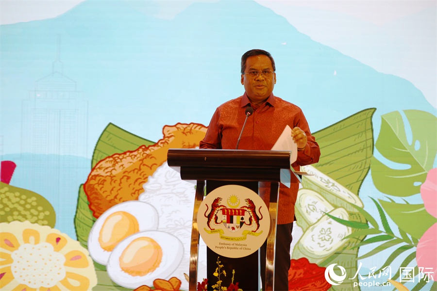 馬來(lái)西亞大使諾曼在6月11日舉行的馬來(lái)西亞美食節(jié)上致辭。人民網(wǎng) 王婧攝