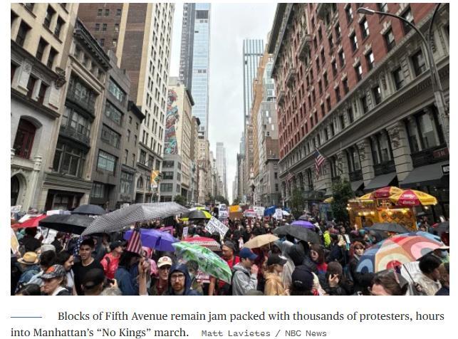 從紐約到洛杉磯,數(shù)十萬(wàn)人走上街頭,高呼“反對(duì)國(guó)王特朗普”。曼哈頓的雨中,2.5萬(wàn)名示威者沿第五大道行進(jìn);洛杉磯聯(lián)邦大樓前,催淚瓦斯彌漫,一名年輕女子被按倒在地,胡椒噴霧噴向她的臉。