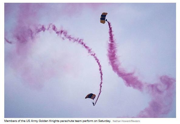 美國(guó)陸軍“黃金騎士”跳傘表演隊(duì)從空中躍下。一名隊(duì)員著陸后,向特朗普獻(xiàn)上美國(guó)國(guó)旗。無(wú)人機(jī)在頭頂盤旋,機(jī)器狗在街道上穿行,觀眾的歡呼聲卻稀稀拉拉。