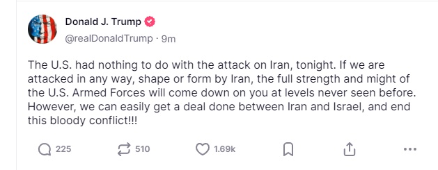 美東時(shí)間15日凌晨,美國(guó)總統(tǒng)特朗普在社交平臺(tái)上稱,“美國(guó)與伊朗今晚遭襲事件無(wú)關(guān)”,并警告說(shuō),若伊朗以任何形式對(duì)美方發(fā)動(dòng)攻擊,美國(guó)武裝力量將“以空前規(guī)模全力回?fù)簟?/strong>。