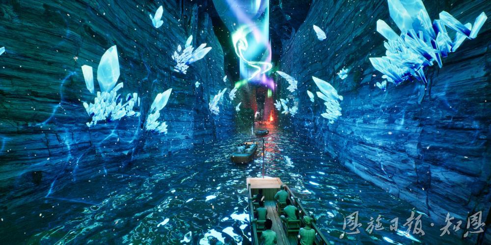 轉(zhuǎn)入“地心奇航”的幽藍(lán)水道,億萬年前的時空裂隙在穹頂豁然展開,現(xiàn)實與幻境的邊界開始溶解。冰涼的霧氣拂過面頰,帶著冰河時代的清冽氣息,船身輕晃間,仿佛遠(yuǎn)古巨獸正在地心蘇醒,轉(zhuǎn)過一道彎,赤紅的光暈突然染紅水面,地心熔巖在巖壁上流淌,特效巨獸突然從巖壁躍出,激起的水花真實濺到臉上那一刻,每個人都成為地心探險故事的主角。