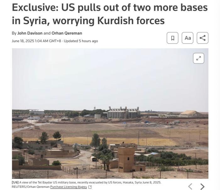 中新網(wǎng)6月18日電 據(jù)路透社當(dāng)?shù)貢r(shí)間17日?qǐng)?bào)道,美軍已從敘利亞?wèn)|北部的兩個(gè)基地撤出。