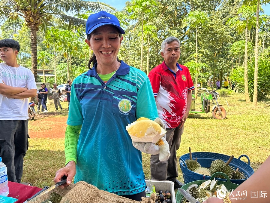 當地民眾在春蓬府果園品嘗榴蓮。人民網記者 孫廣勇攝