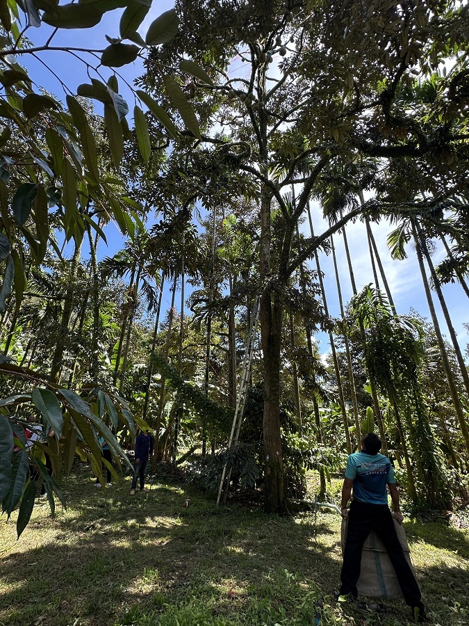 春蓬府果農從高高的榴蓮樹上收割榴蓮。人民網記者 孫廣勇攝