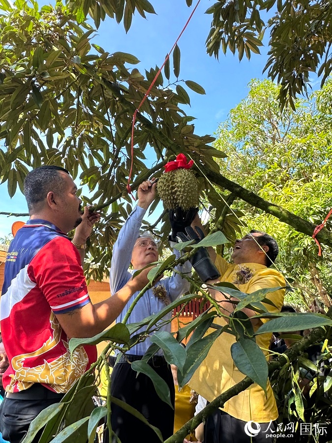 中泰嘉賓共同收割第一顆榴蓮。人民網記者 孫廣勇攝