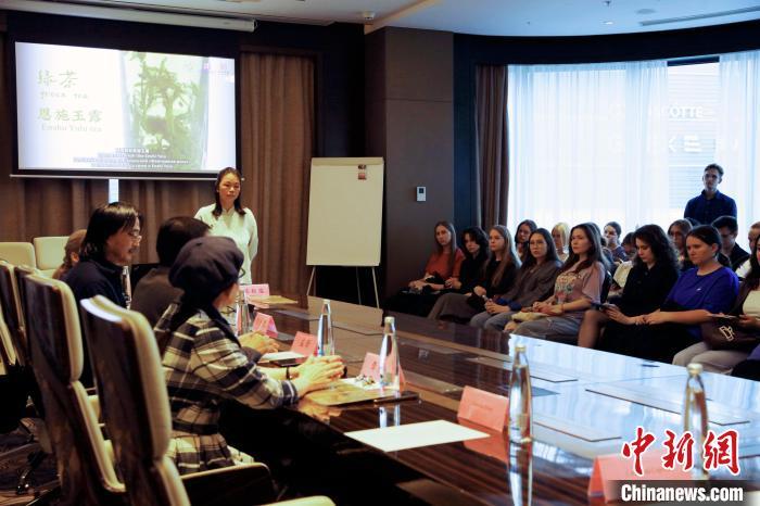 當(dāng)?shù)貢r間6月23日,“從茶園到茶港——萬里茶道建筑遺產(chǎn)與茶文化雙主題展”在莫斯科中國貿(mào)易中心舉行。圖為與會嘉賓與俄羅斯青年學(xué)生對話交流。中新社記者 田冰 攝