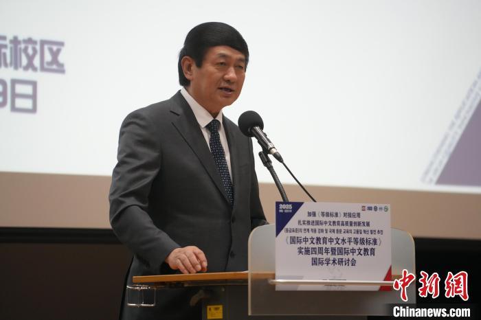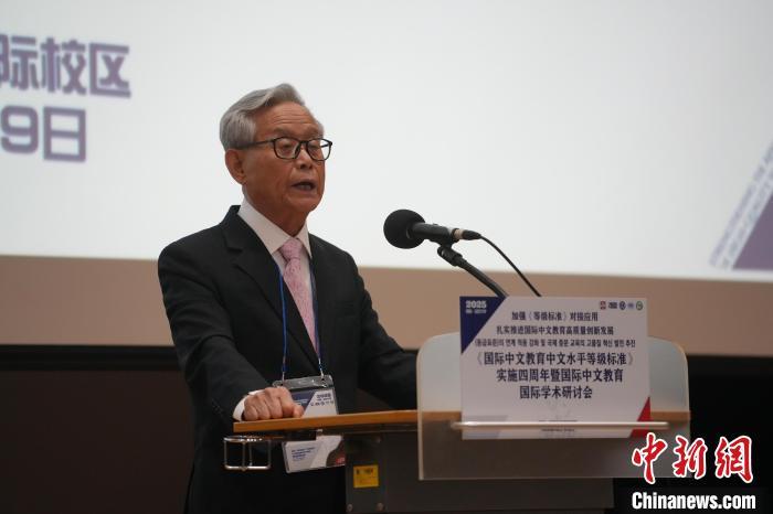 6月28日,《國際中文教育中文水平等級標(biāo)準(zhǔn)》實(shí)施四周年國際學(xué)術(shù)會議在韓國仁川開幕。圖為世界漢語教學(xué)學(xué)會會長鐘英華作主旨發(fā)言。中新網(wǎng)記者 劉旭 攝