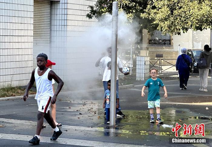 當?shù)貢r間7月1日,法國巴黎遭遇高溫紅色警報。圖為一群兒童在巴黎郊外的防暑設(shè)施周圍活動。 中新社記者 李洋 攝