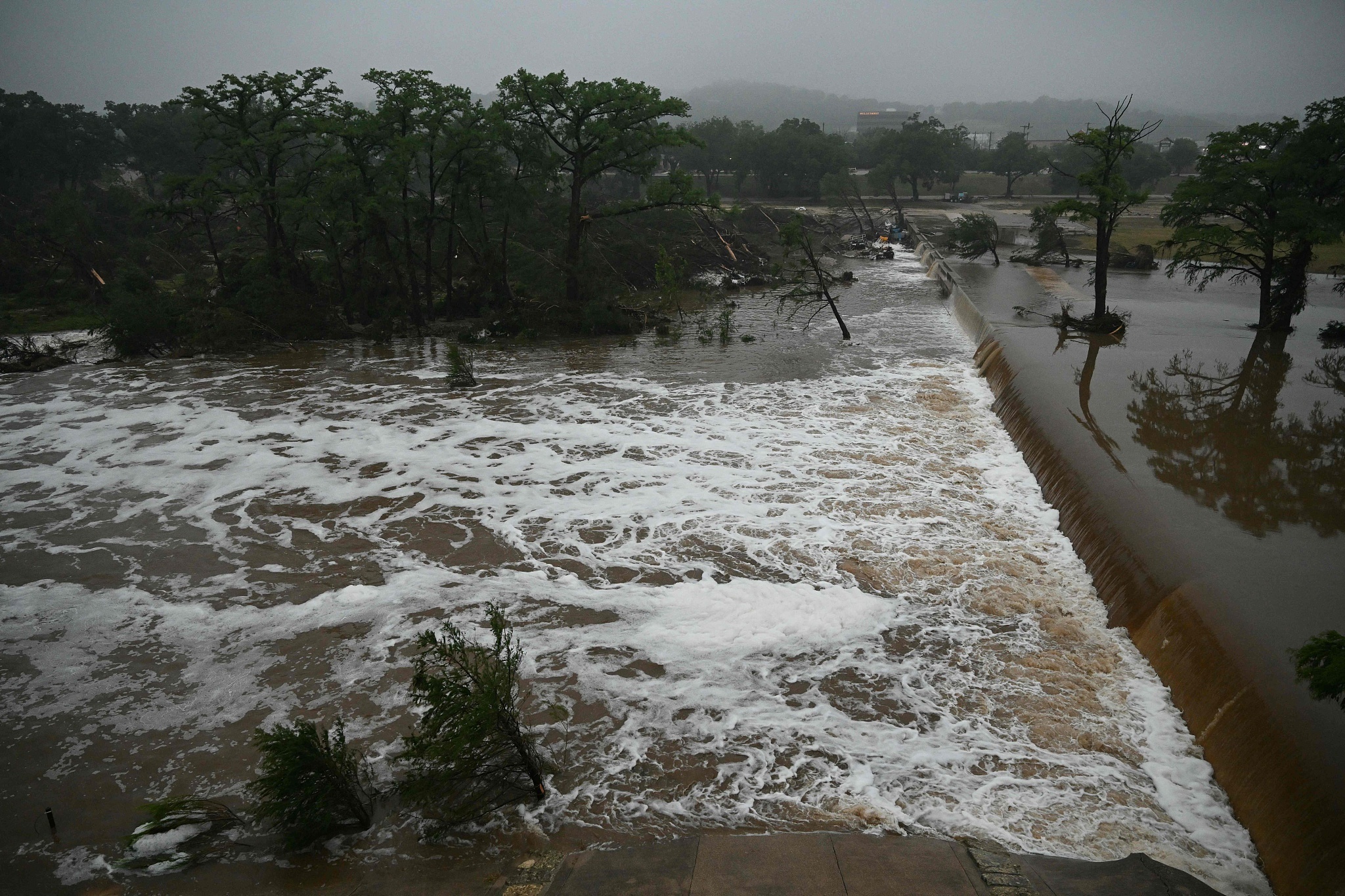 美國國家氣象局說,4日凌晨,瓜達(dá)盧普河水位3小時內(nèi)上漲約6.7米,之后因水位過高水位儀無法測量。(央視記者 劉驍騫)