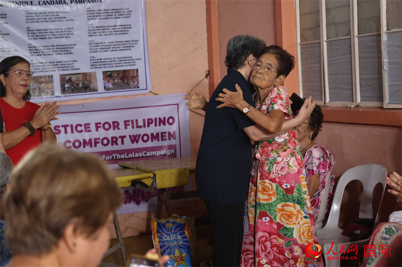 菲律賓華裔青年聯(lián)合會創(chuàng)會會長洪玉華與馬帕尼克村慰安婦幸存者擁抱。人民網記者 樊帆攝