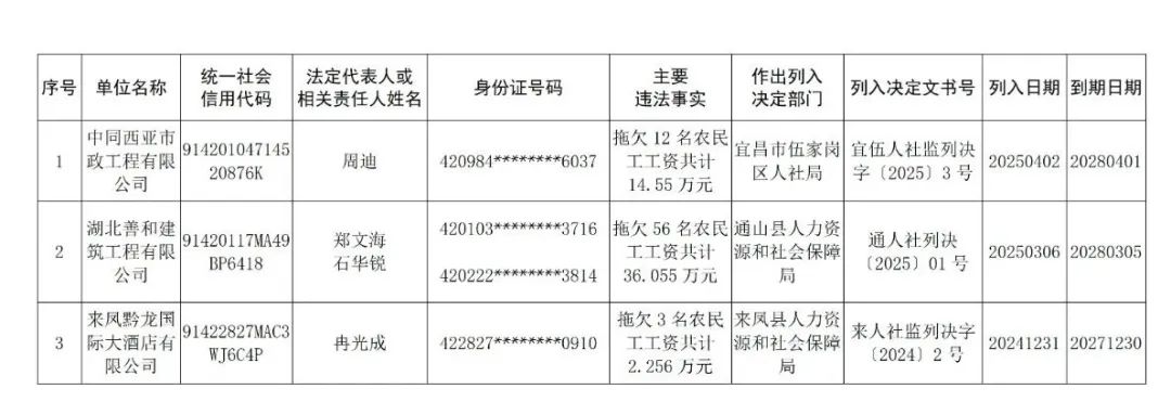 為進(jìn)一步加大對(duì)重大勞動(dòng)保障違法行為的懲戒力度,強(qiáng)化社會(huì)輿論監(jiān)督,維護(hù)勞動(dòng)者合法權(quán)益,根據(jù)《重大勞動(dòng)保障違法行為社會(huì)公布辦法》(人力資源和社會(huì)保障部令第29號(hào))和《拖欠農(nóng)民工工資失信聯(lián)合懲戒對(duì)象名單管理暫行辦法》(人力資源和社會(huì)保障部令第45號(hào)),現(xiàn)向社會(huì)公布2025年第二批重大勞動(dòng)保障違法行為案件及拖欠農(nóng)民工工資失信聯(lián)合懲戒對(duì)象名單。