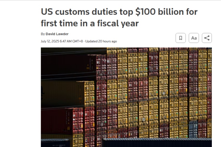 數(shù)據(jù)顯示,6月美國海關(guān)關(guān)稅總額高達(dá)約270億美元,較去年同期暴增301%,這使得美國單一財(cái)年內(nèi)關(guān)稅收入累積金額首次突破1000億美元。