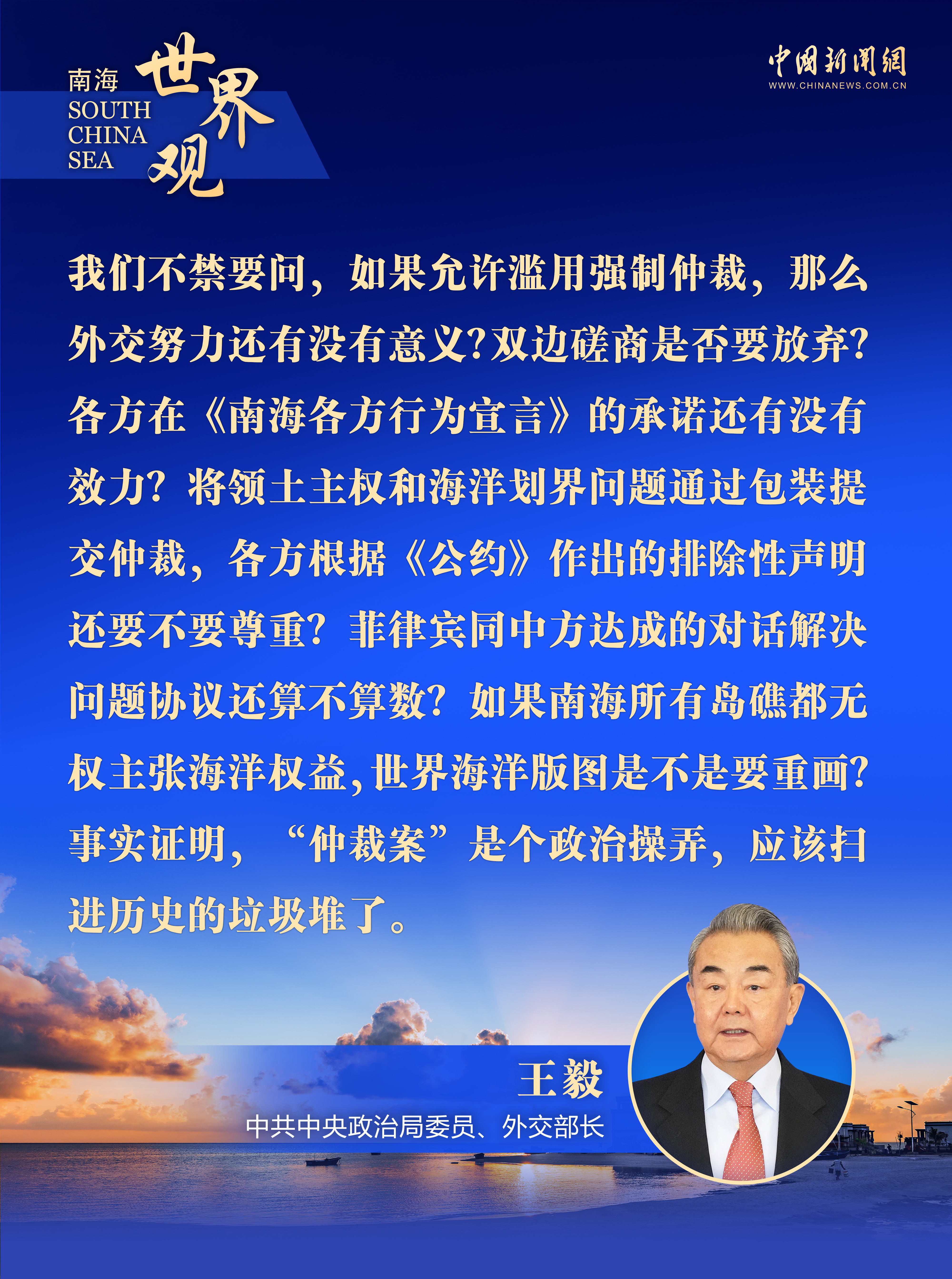 王毅還發(fā)出六連問,指出:如果允許濫用強(qiáng)制仲裁,那么外交努力還有沒有意義?雙邊磋商是否要放棄?各方在《南海各方行為宣言》的承諾還有沒有效力?將領(lǐng)土主權(quán)和海洋劃界問題通過包裝提交仲裁,各方根據(jù)《公約》作出的排除性聲明還要不要尊重?菲律賓同中方達(dá)成的對話解決問題協(xié)議還算不算數(shù)?如果南海所有島礁都無權(quán)主張海洋權(quán)益,世界海洋版圖是不是要重畫?