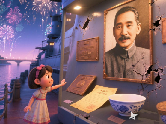 中山艦的修復(fù)與重生,象征著歷史傷痕的愈合與精神血脈的賡續(xù)。1997年整體打撈,如打撈起一段沉沒的民族記憶。修復(fù)者們以敬畏之心撫平鋼鐵創(chuàng)傷,還原其歷史原貌,使其成為“移動(dòng)的教科書”。今日艦上陳列的長(zhǎng)方形銅牌、青花瓷碗、泛黃收?qǐng)?bào)單,這些出水文物皆如時(shí)光之窗,使歷史可觸可感。