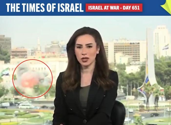 外媒拍下敘軍事總部遭空襲(紅圈處)畫面。圖/《以色列時報》