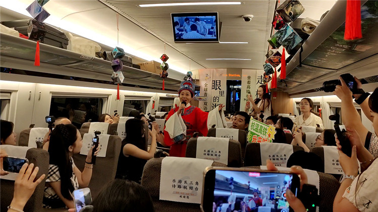 青年主播們?cè)诤紲馗哞F上欣賞黃梅戲表演。中國(guó)傳媒大學(xué)供圖