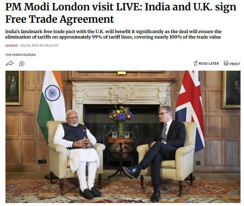 中新網(wǎng)7月24日電 綜合《印度教徒報》、英國廣播公司(BBC)報道,當(dāng)?shù)貢r間24日,印度與英國簽署了一項自由貿(mào)易協(xié)議。報道稱,這項協(xié)議的簽署正值印度總理莫迪訪問英國之際。
