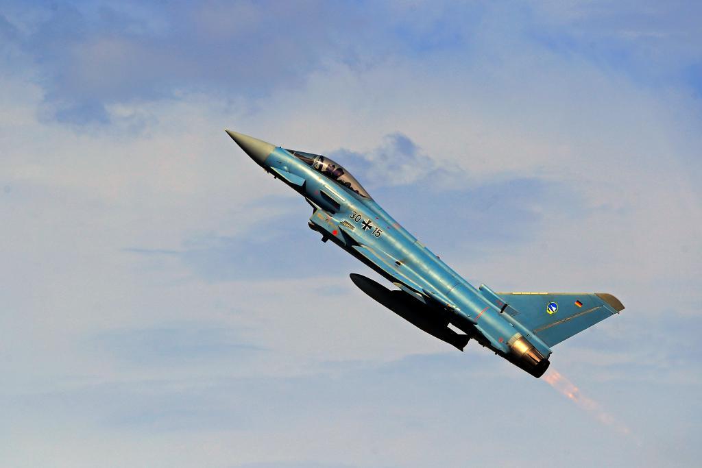 2024年8月31日,德國(guó)空軍“臺(tái)風(fēng)”戰(zhàn)斗機(jī)在布加勒斯特國(guó)際航展上進(jìn)行飛行表演。新華社發(fā)(克里斯泰爾攝)