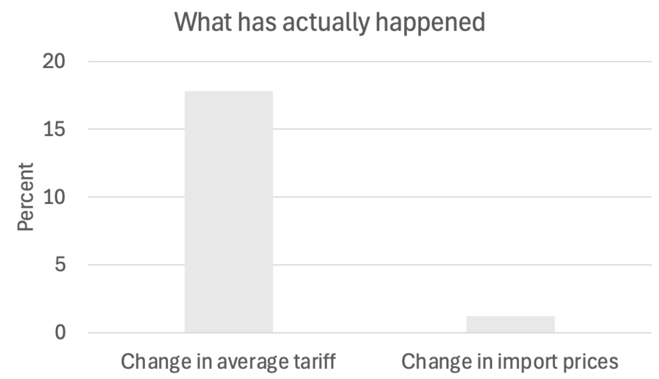 克魯格曼曬出數(shù)據(jù)稱(chēng),如果真按美國(guó)政府所說(shuō),關(guān)稅由外國(guó)承擔(dān),美國(guó)買(mǎi)主不受影響,那商品進(jìn)入美國(guó)的價(jià)格應(yīng)當(dāng)降低,以抵消加征的關(guān)稅,這樣才能讓物價(jià)和之前持平。