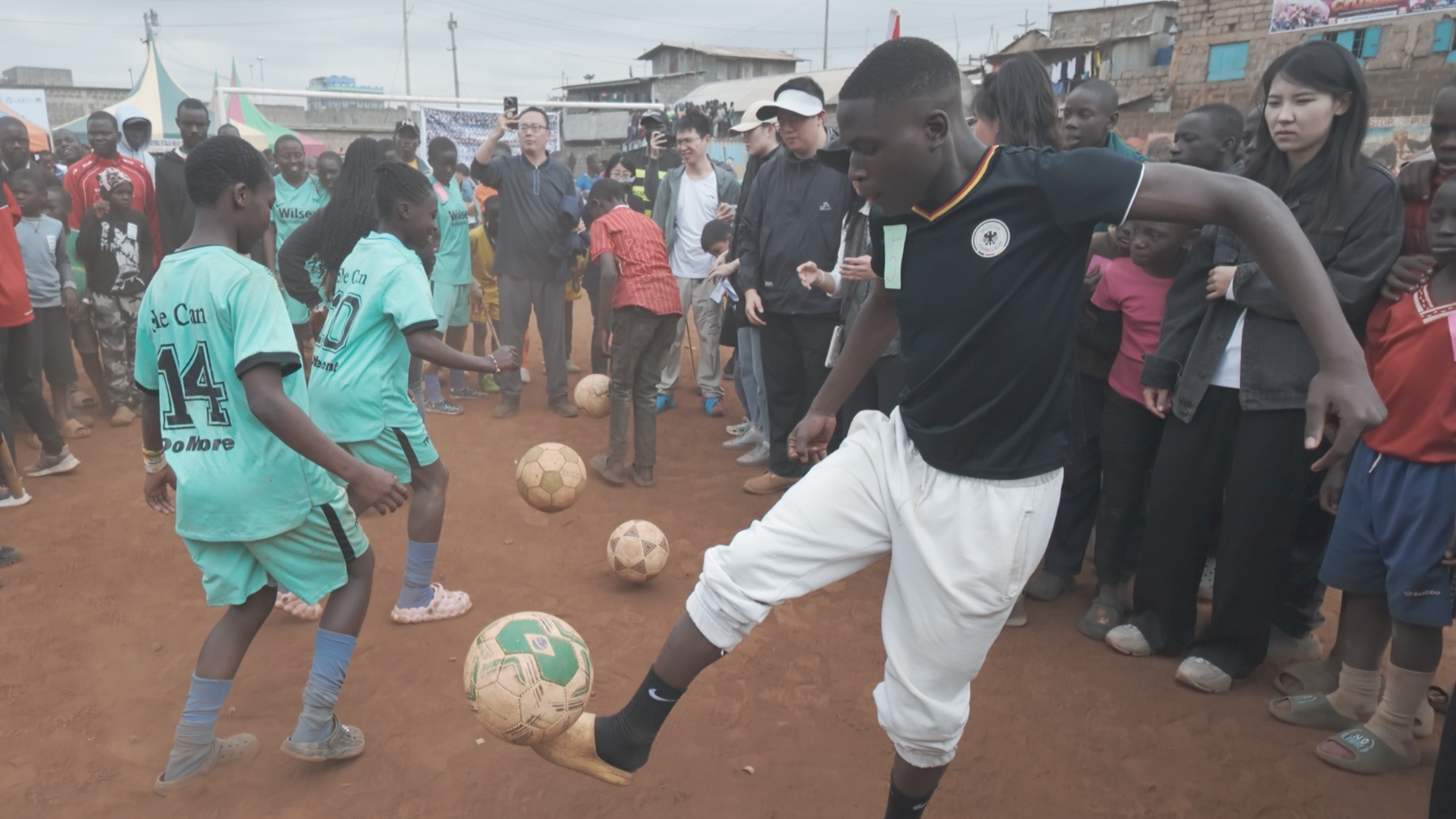 作為傳統(tǒng)重頭戲,本屆足球賽事的規(guī)模再創(chuàng)新高,共有24所社區(qū)學(xué)校的47支隊伍,在 94場激烈角逐后決出勝負(fù)。決賽現(xiàn)場氣氛熱烈,座無虛席。中國駐肯尼亞大使館在賽后舉辦的趣味“顛球比賽”環(huán)節(jié)更是吸引了眾多高手一展身手。