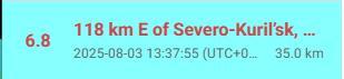 中新網(wǎng)8月3日電 據(jù)美國(guó)地質(zhì)調(diào)查局地震信息網(wǎng)消息,俄羅斯千島群島北庫(kù)里爾斯克以東118公里處于北京時(shí)間3日發(fā)生6.8級(jí)地震,震源深度35公里。