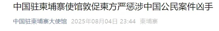 中使館:敦促柬方嚴懲涉中國公民案件兇手