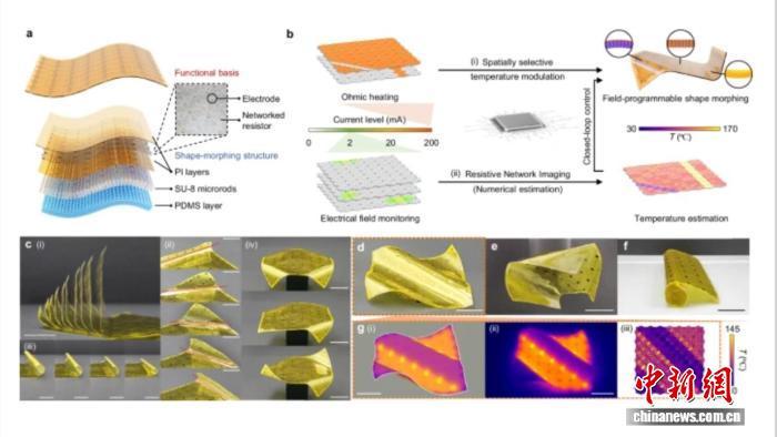 在本項研究中,論文共同通訊作者、韓國科學(xué)技術(shù)院Inkyu Park和Jung Kim與同事合作制作出一個機器人折疊薄片,使用密集分布的熱敏電元件構(gòu)成,受熱可改變形狀。他們用一張40平方厘米的薄片展示了這一方法,該薄片由308個兼具加熱器和感受器功能的電阻構(gòu)成。這種雙功能使之可以實現(xiàn)精確控制移動,系統(tǒng)可根據(jù)感受器反饋作出持續(xù)調(diào)整。