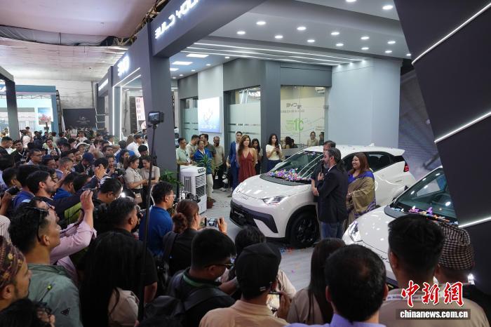 8月6日,尼泊爾全國(guó)規(guī)模最大的車展在首都加德滿都開幕,吸引超過(guò)10家中國(guó)品牌參展。圖為比亞迪Atto 1電動(dòng)汽車尼泊爾首發(fā)儀式吸引眾多參觀者?!≈行律缬浾? 崔楠 攝