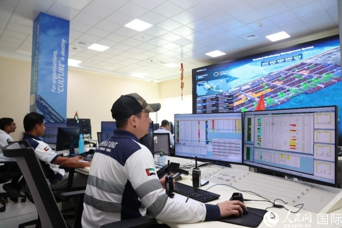 與會(huì)嘉賓會(huì)后到中遠(yuǎn)海運(yùn)港口阿布扎比碼頭中央控制室參觀。圖為工作人員使用數(shù)字孿生系統(tǒng)查看作業(yè)情況。人民網(wǎng)記者 任皓宇攝