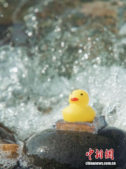 本項(xiàng)研究開(kāi)發(fā)出的水凝膠將一只橡膠鴨粘在海洋中的巖石上進(jìn)行測(cè)試(圖片來(lái)自論文作者)。施普林格·自然 供圖