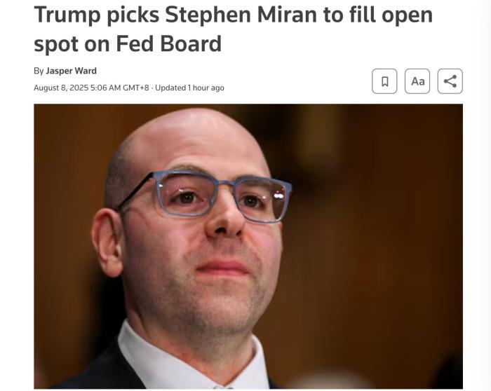 中新網(wǎng)8月8日電 據(jù)路透社報(bào)道,當(dāng)?shù)貢r(shí)間7日,美國(guó)總統(tǒng)特朗普表示,將提名現(xiàn)任白宮經(jīng)濟(jì)顧問(wèn)委員會(huì)主席斯蒂芬·米蘭接替剛剛空出的美聯(lián)儲(chǔ)理事席位,任期至2026年1月31日。