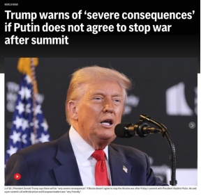 △美聯(lián)社報道,特朗普警告,如果普京峰會期間不同意停戰(zhàn),將產生“嚴重后果”。