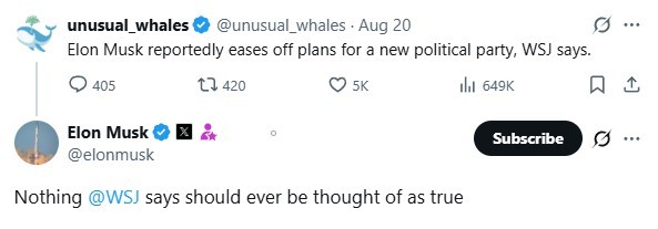 據(jù)《華爾街日?qǐng)?bào)》此前援引知情人士報(bào)道,馬斯克已告知盟友,他希望將注意力集中在自己的公司上,并不愿因組建一個(gè)可能分流共和黨選民的第三政黨而疏遠(yuǎn)有權(quán)勢(shì)的共和黨人。