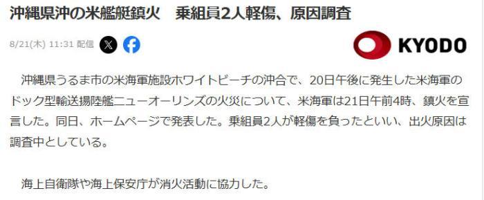 據(jù)報(bào)道,當(dāng)?shù)貢r(shí)間20日下午,在沖繩縣宇流麻市美軍設(shè)施“白灘”近海的美船塢運(yùn)輸?shù)顷懪灐靶聤W爾良”號(hào)發(fā)生火災(zāi),隨后包括日本海上自衛(wèi)和海上保安廳等日方人員也參與了滅火行動(dòng)。