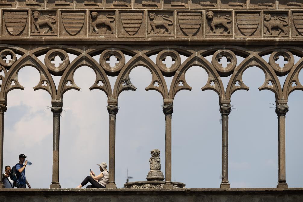 8月19日,在意大利維泰博,游客在烈日下參觀。新華社記者李京攝