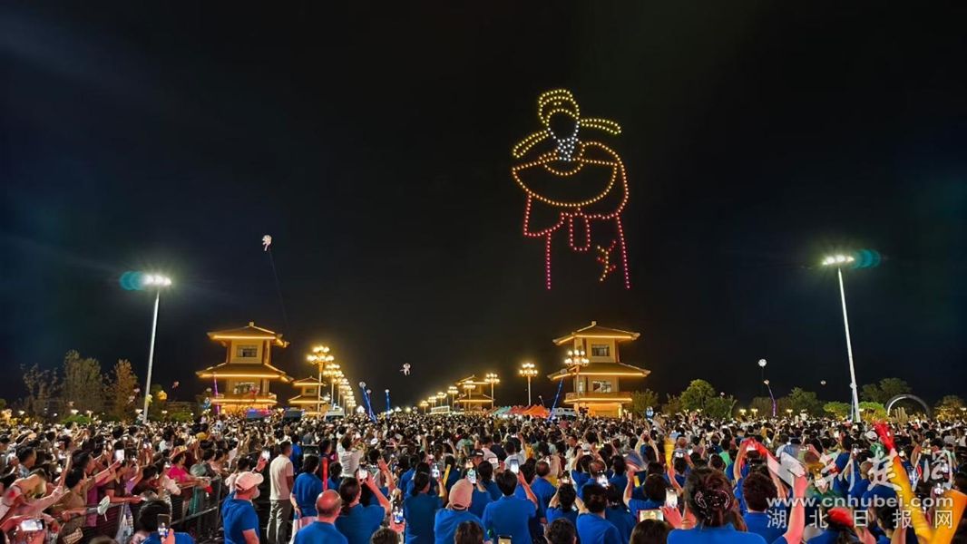夜幕中,三百架無(wú)人機(jī)騰空而起,伴隨著悠揚(yáng)的黃梅調(diào),在天空中次第變幻出黃梅戲服、“莫錯(cuò)過(guò)”字樣等立體光影圖案,與兩岸璀璨燈光交織成一幅科技與藝術(shù)深度融合的絢麗畫(huà)卷,引來(lái)觀眾驚嘆連連。