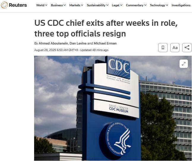 據(jù)報道,美國疾控中心醫(yī)療官員黛布拉·霍里、免疫與呼吸道疾病中心主任德米特·達(dá)斯卡拉基斯、美國國家新發(fā)與人畜共患傳染病中心主任丹·杰尼根均已辭去職務(wù)。