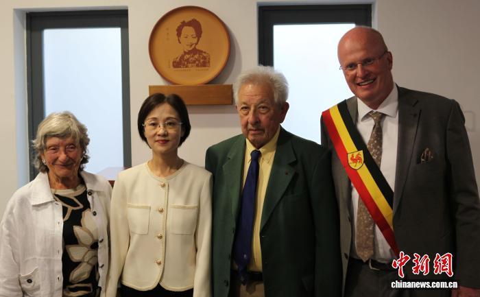 當(dāng)?shù)貢r(shí)間8月29日,中國駐比利時(shí)使館與比利時(shí)艾克興市政府共同舉辦活動(dòng),紀(jì)念當(dāng)年從德國納粹手中救下艾克興市民的比利時(shí)“國家英雄”錢秀玲。圖為中國駐比利時(shí)使館臨時(shí)代辦李艷(左二)、艾克興市市長塞巴斯蒂安·德尚(右一)和錢秀玲家屬在錢秀玲頭像紫砂盤前合影留念。中新社記者 德永健 攝